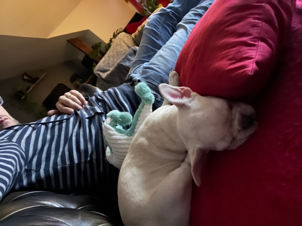 Buddy est un chiot stressé ! Il a droit au canap’ à côté de son maître pour la sieste… Et sur du rouge en plus, ce qui lui va particulièrement bien au teint !