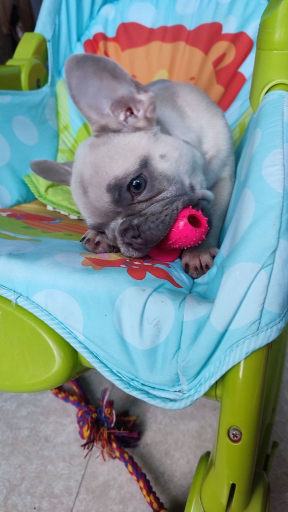 Uny a dignement fêté ses 4 mois avec sa famille ; voilà un chiot gâté : plein de doudous et de jouets, et une nouvelle tétine pour faire ses jolis crocs !
