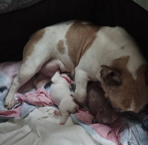Et pendant que les deux pépères roupillent, les deux petits mangent tranquilles, en mode lévitation pour Vang – je n’avais encore jamais vu un chiot faire un tour complet sur lui-même, tout en étant accroché à une mamelle ! Je comprend qu’il se fasse « virer » par les deux costauds… A force de gigoter !