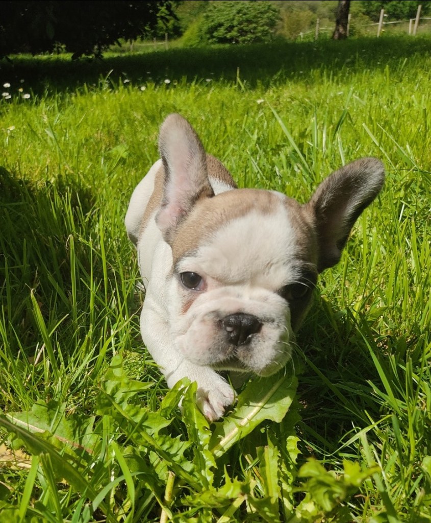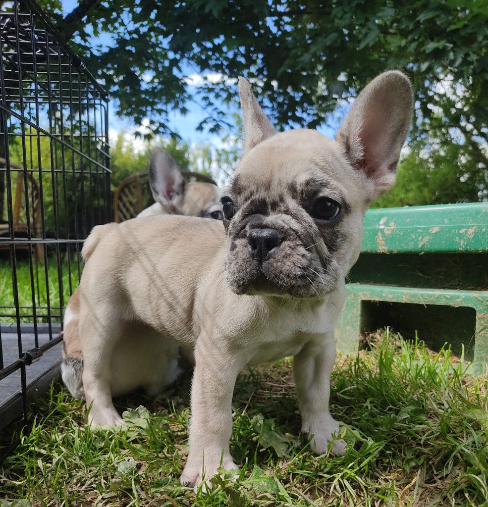 Volt, quant à lui, est le cascadeur de la fratrie : c’est le premier à être sorti sans aide du parc de la nursery, et à grimper sur le couvercle du réservoir de gaz (vert, juste derrière lui). Il a des marques merle (Joy, la maman, est merle fantôme et a transmis le gène merle à sa tribu) sur la tête et les oreilles. Pour le reste du corps, il est très clair, isabelle sans doute. Ça fait un très joli chiot, qui ne risque pas d’être confondu avec un autre. Il est adepte également des câlins sur les genoux.