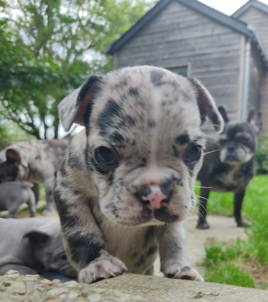 Je n’ai pas encore mis Stitch, le papa, en présence des chiots, car je ne suis pas sûre de la réaction de Ragga. Le sevrage physique n’est pas terminé, et elle est très protectrice. Stitch n’a jamais montré autre chose que de la curiosité et de la bienveillance avec toutes ses autres portées (Radieuse, Shelby, Joy), et j’attends encore quelques jours pour plus de sérénité.