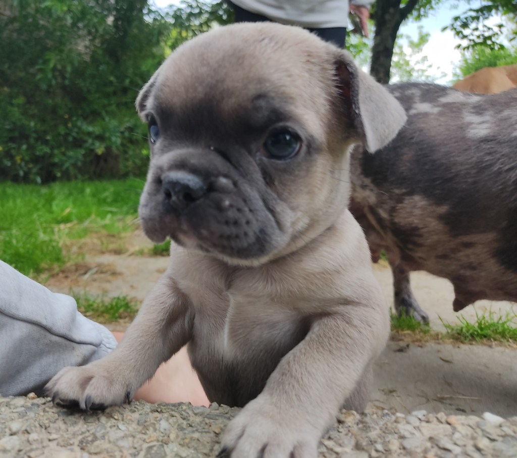 Vulcain est né bleu, comme la plupart de sa fratrie. En quelques jours, il s’est transformé, sans doute en fauve charbonné. Il avait déjà son dossier photo en tant que Vulcain, il est donc resté Vulcain. Sa future famille aura le loisir de le renommer si elle le désire. En arrière plan, vous avez Ragga, la maman, qui surveille ses bébés avec attention.