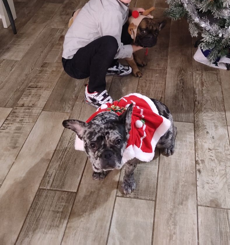 A Ragga à Noël, version mère Noël, avec son pote Tango – qui a l’air moins content qu’elle de ses nouveaux vêtements !