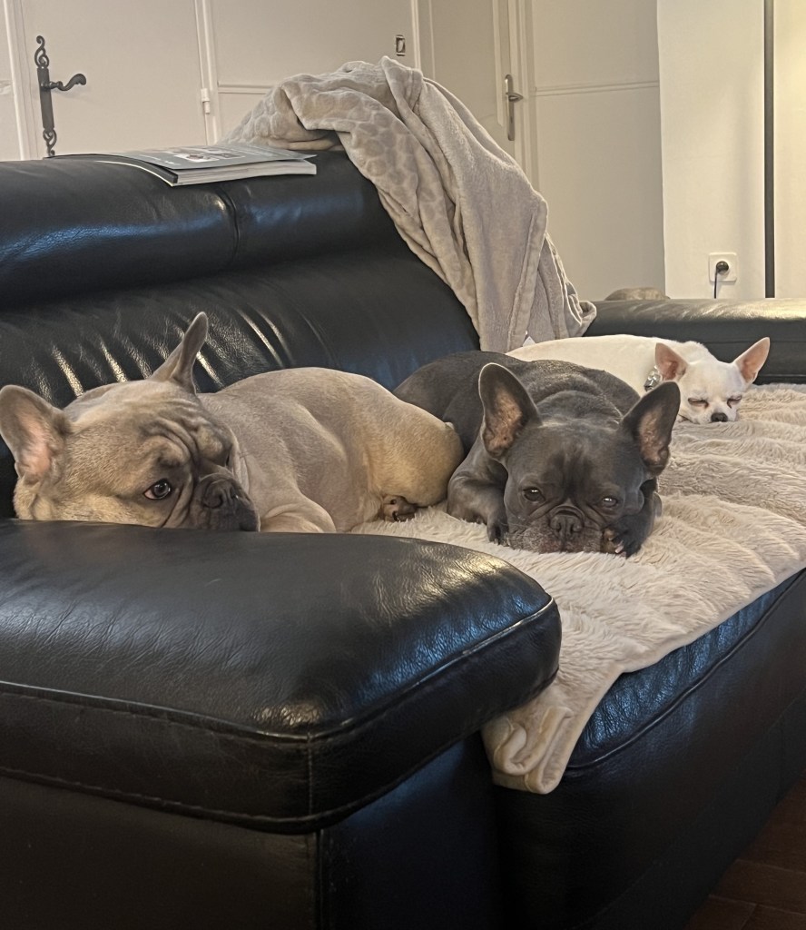 Ils sont beaux, n’est ce pas tous les trois ? Et ils se livrent à l’activité favorite des bouledogues (y compris la troisième, qui n’est pas un bouledogue) : la sieste ! Ce sont des chiens stressés, ça se voit !