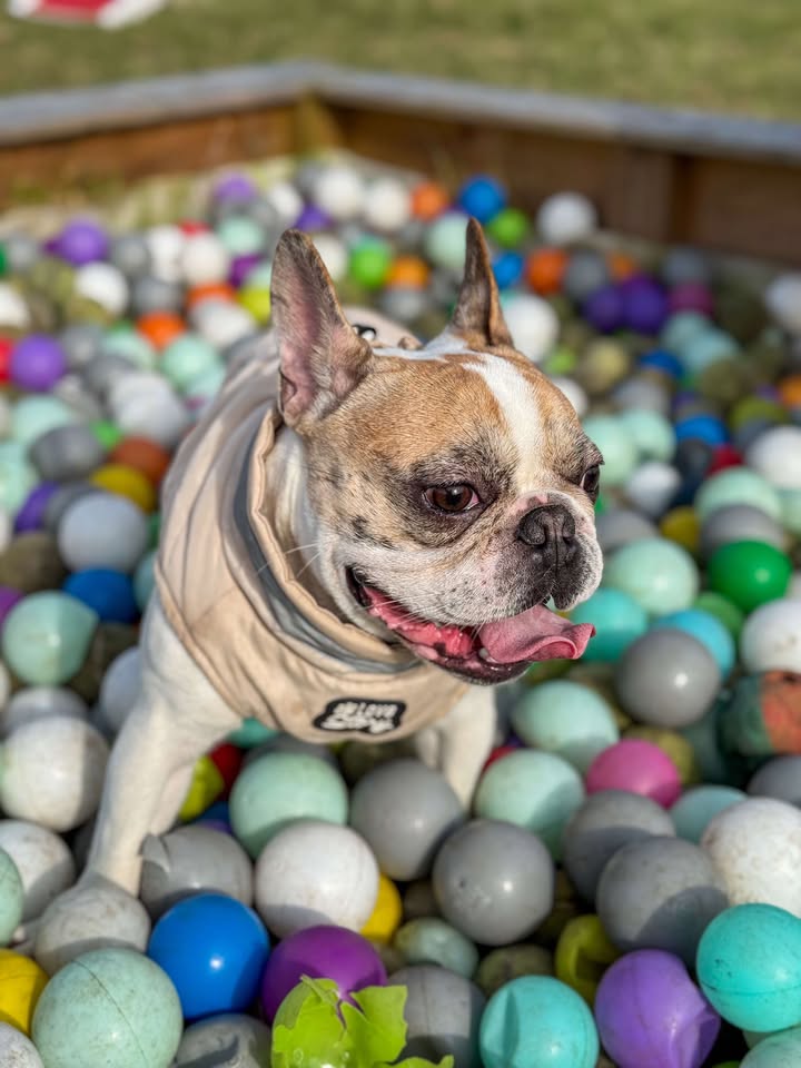 Il nous fait sa tête de bouledogue français têtu dans sa piscine de boules. Mais, tel que je le connais, même pas peur !
