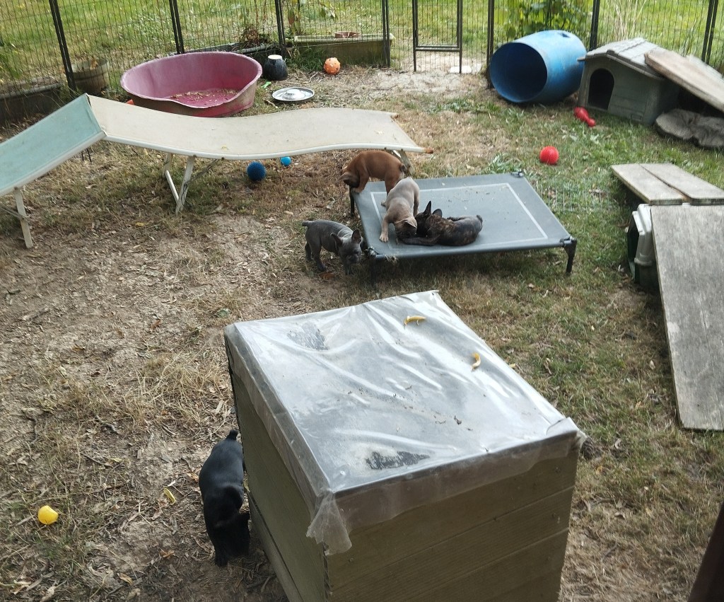 Il est en train de jouer à la bagarre avec sa grande copine Aïko, les autres sont peu intéressées. Aslan est le diablotin de service : je l’ai surpris à promener les gamelles d’eau, un coup je les retrouve sous le trampolin, un coup dans le bidon bleu… Il en faut toujours un comme ça dans une portée, eh bien cette fois c’est Aslan !