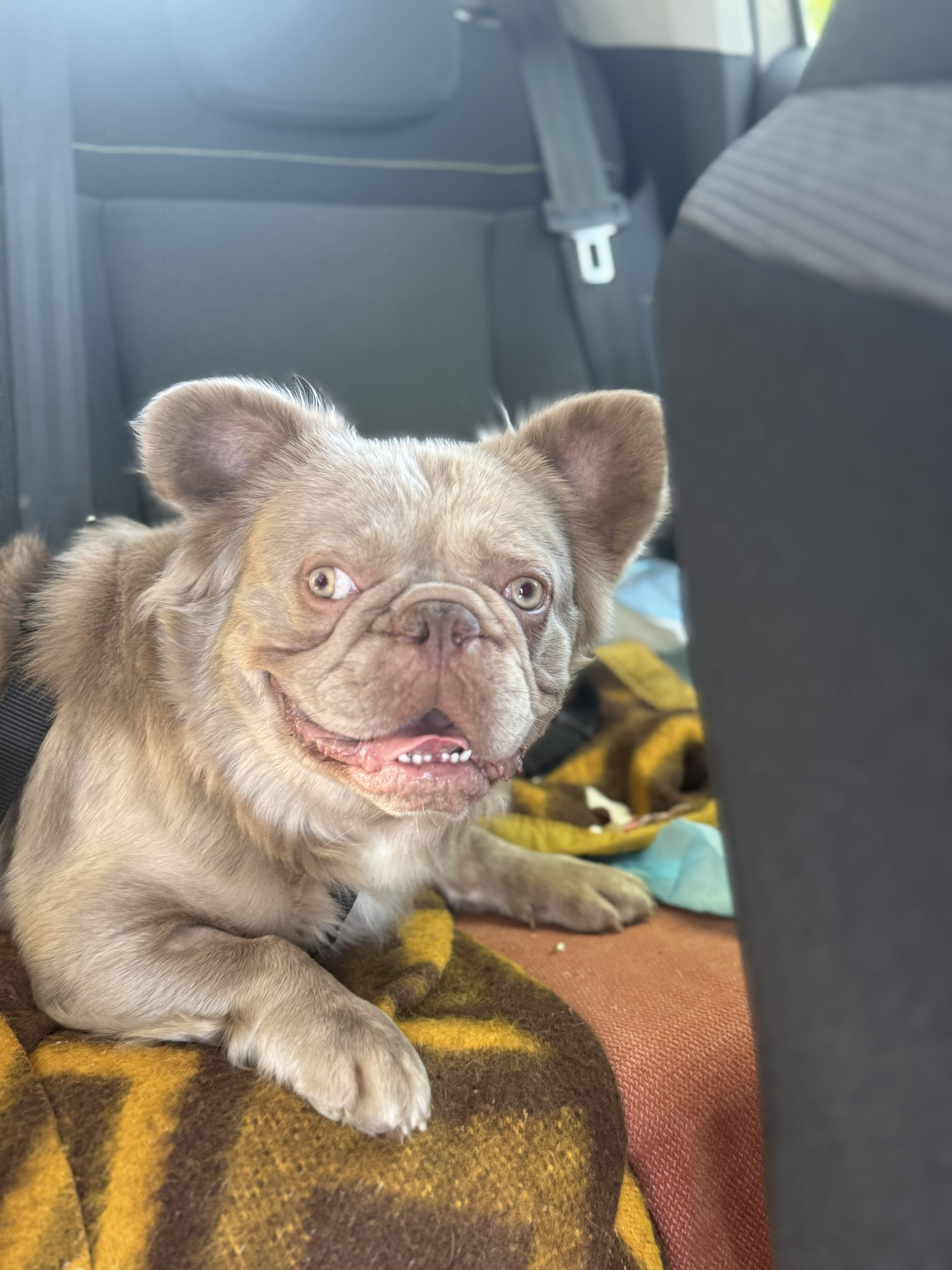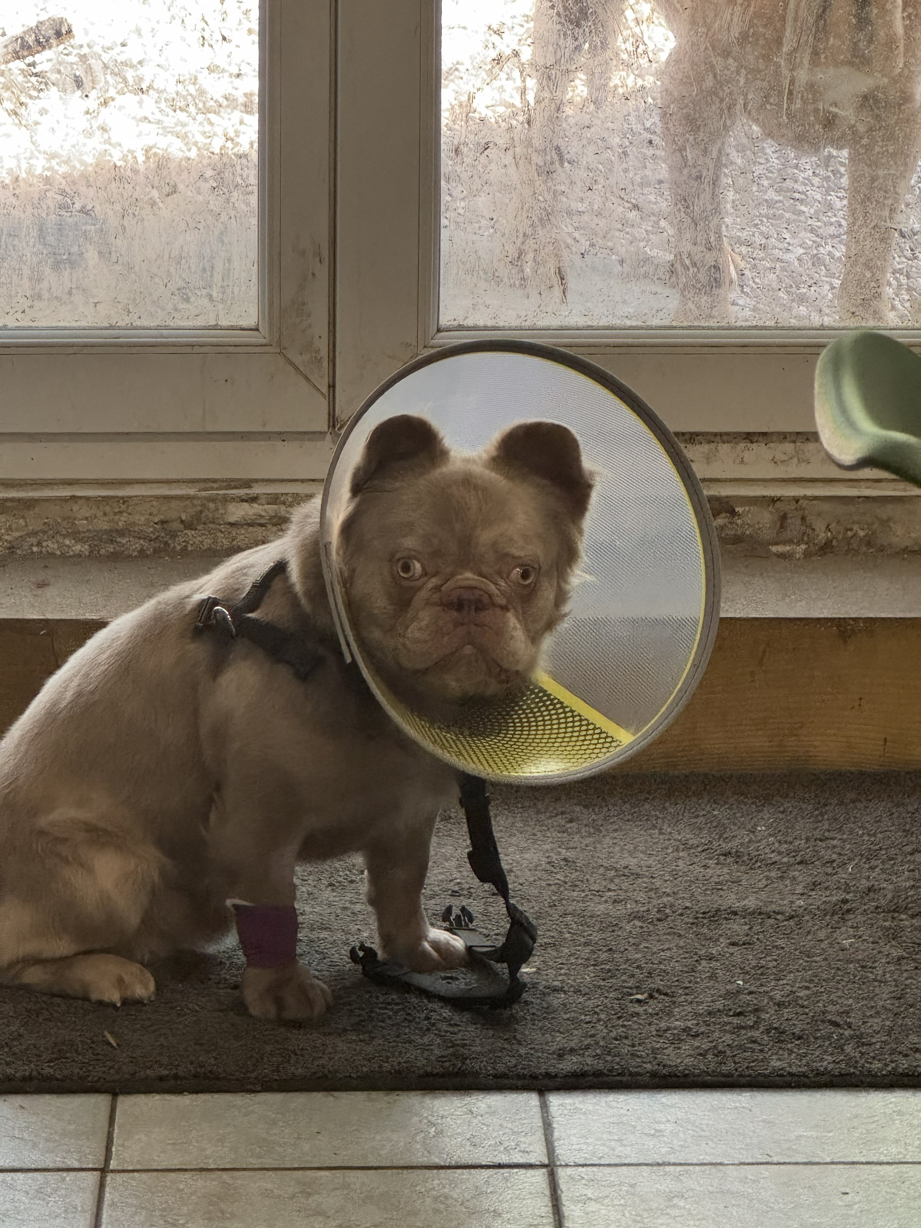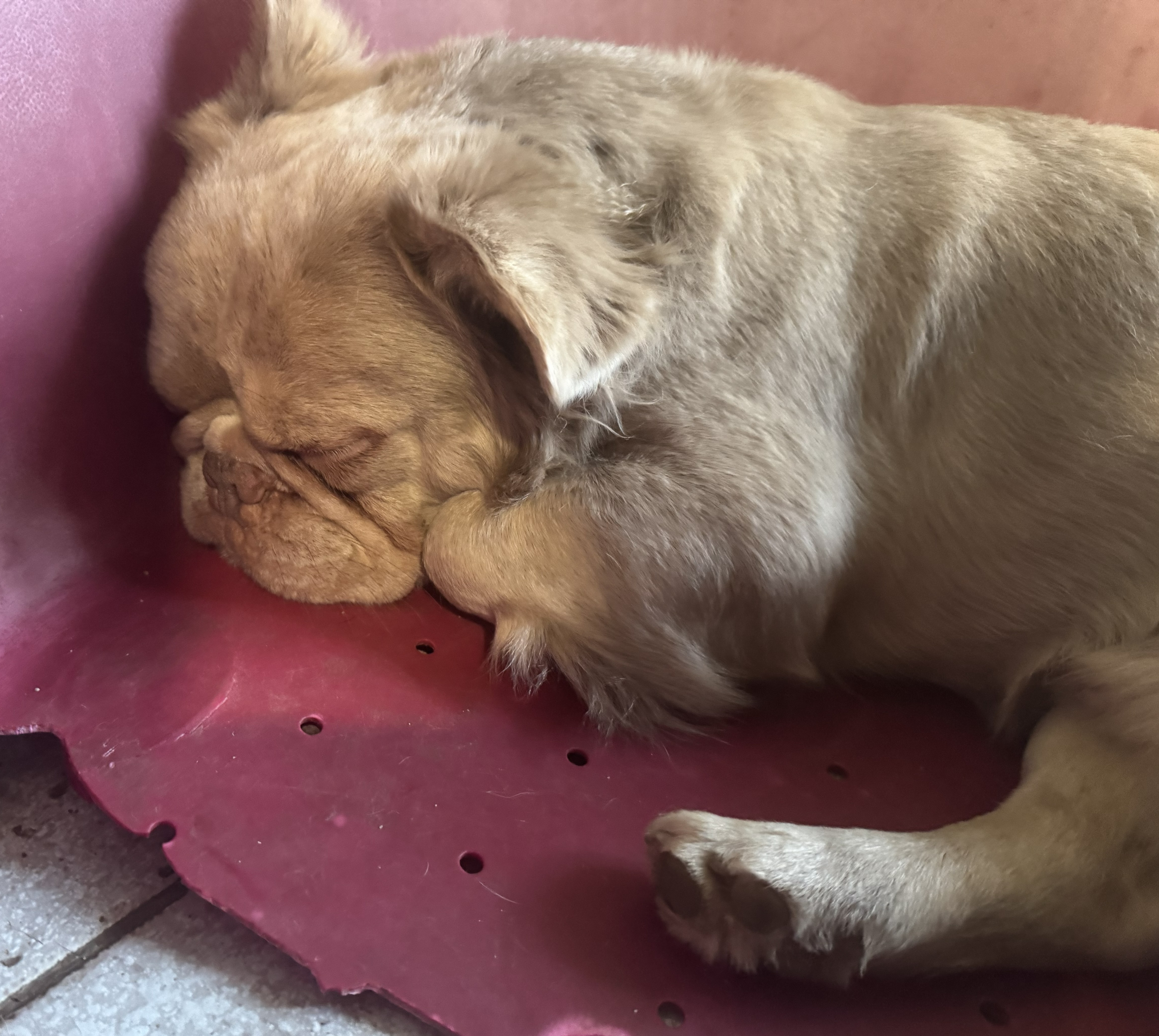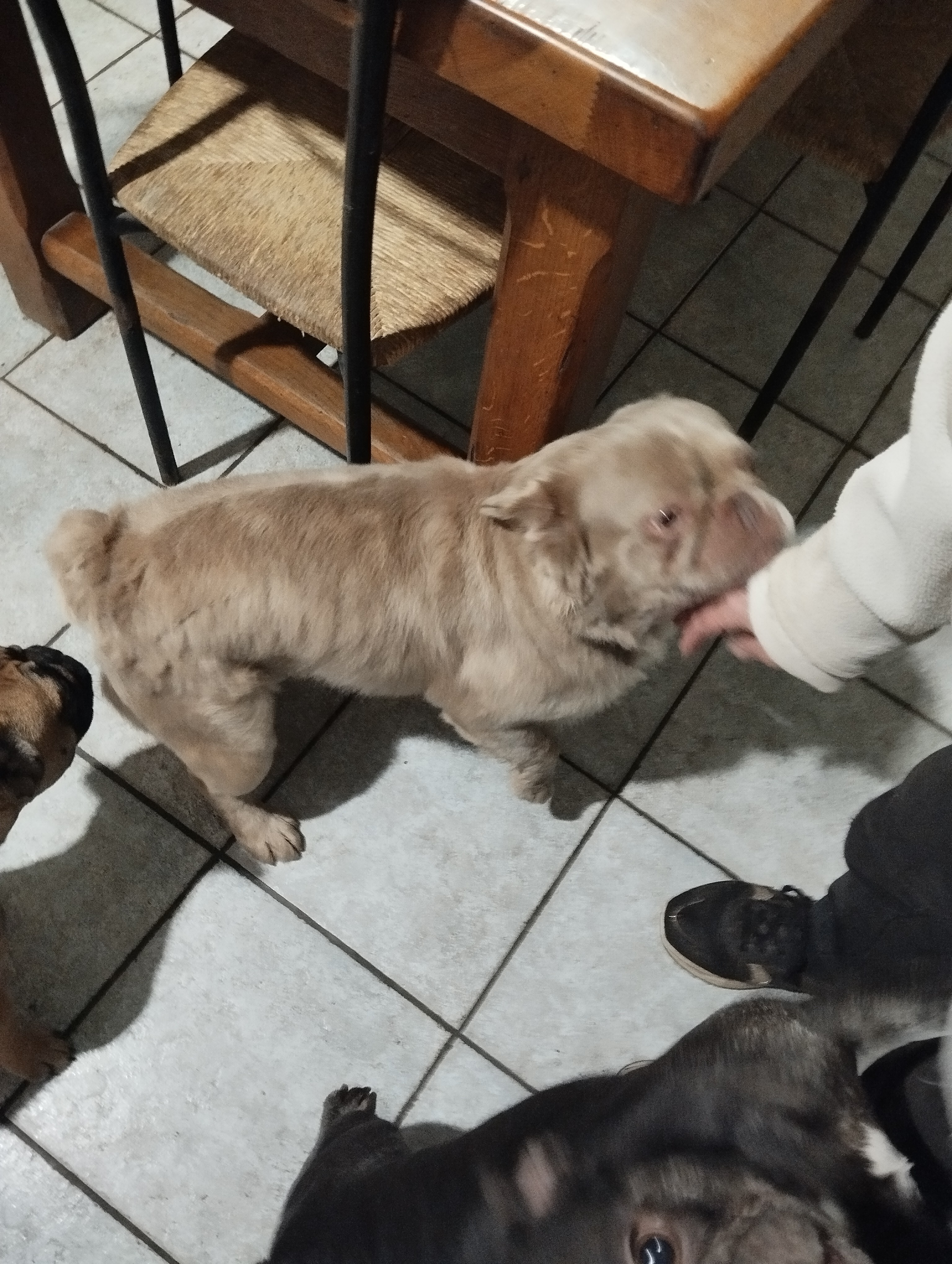 Les dernières aventures de Vichnou : je trouvais qu’il ronflait beaucoup, qu’il avait du mal à reprendre haleine après les jeux, et qu’il avait souvent les yeux rouges et qui coulaient. Donc, rendez-vous chez les vétérinaires G3Vet, qui ont confirmé qu’une rhinoplastie et peut-être un « voile du palais » améliorerait notablement sa respiration. Aussitôt dit, aussitôt fait, je n’ai pas voulu attendre qu’il fasse trop chaud. Résultat : les vétos ont défilé au bloc pour admirer le seul BF fluffy du coin, la stagiaire a noté fébrilement, et quand je l’ai récupéré, j’ai eu plein de compliments sur sa gentillesse et sa beauté ! Merci à tout le staff Plessé/Guéméné-Penfao pour sa gentillesse et sa disponibilité.
