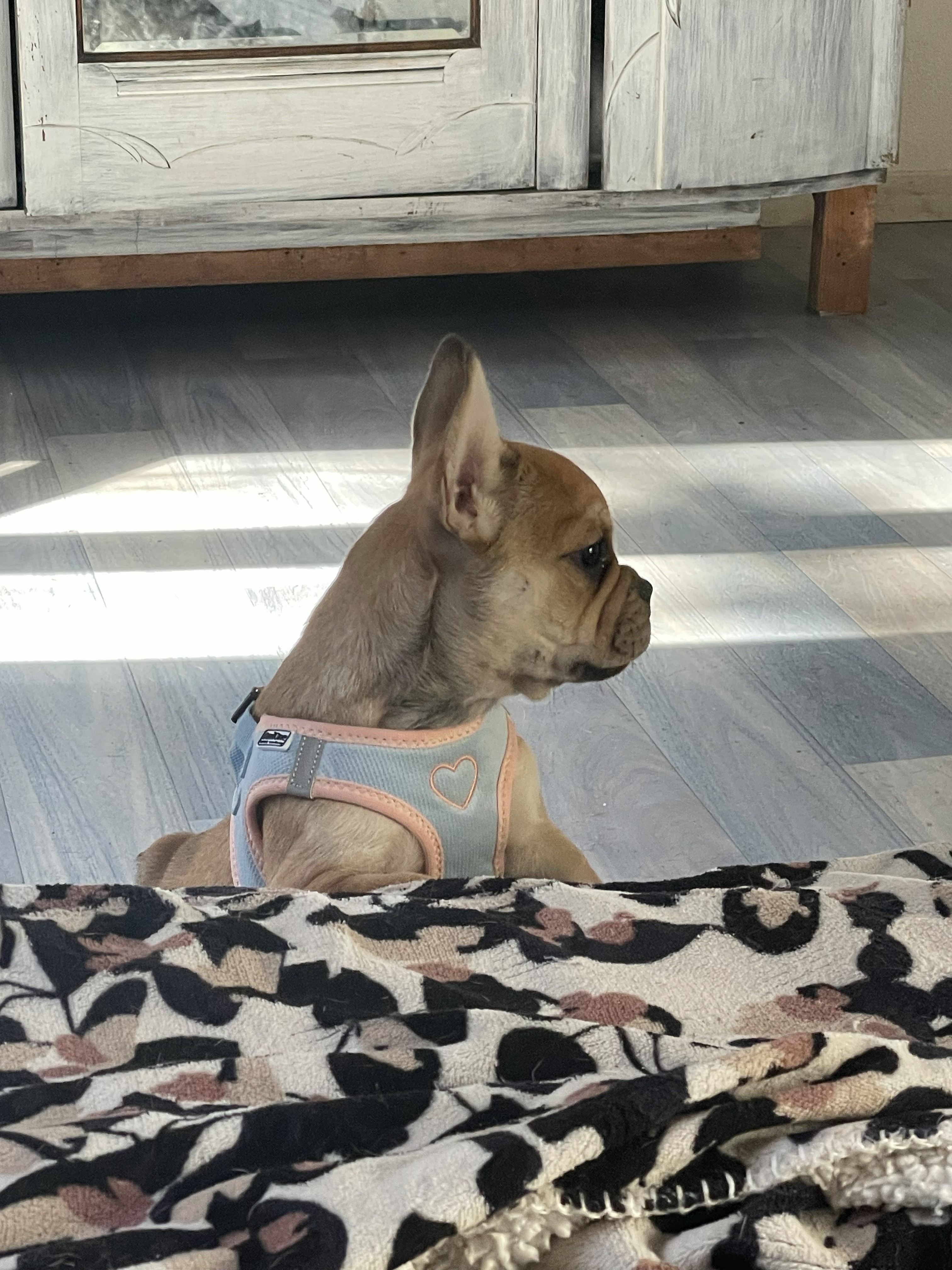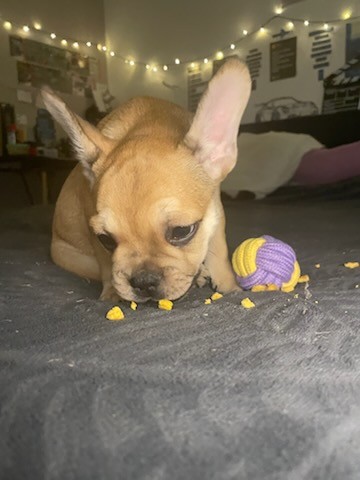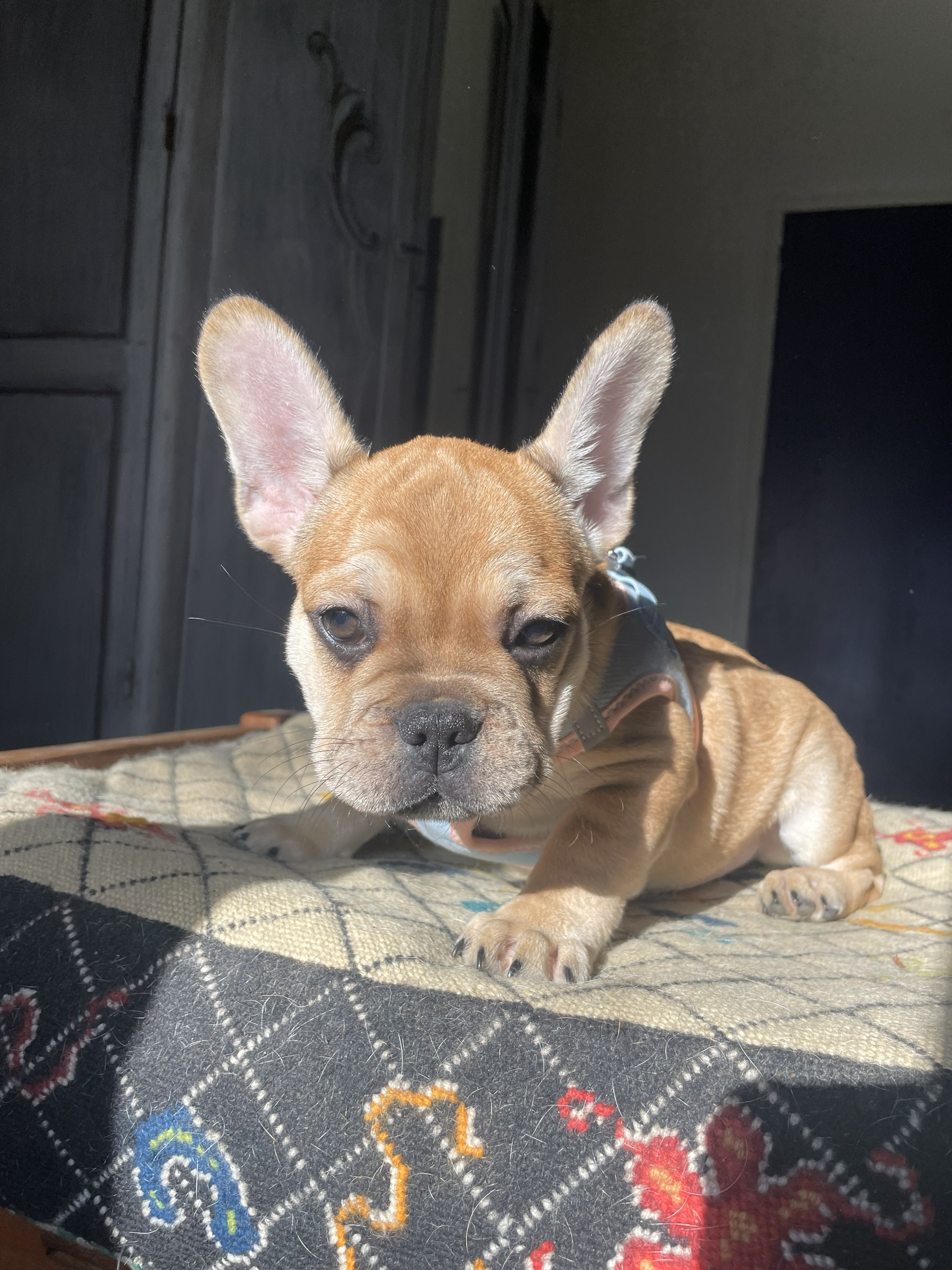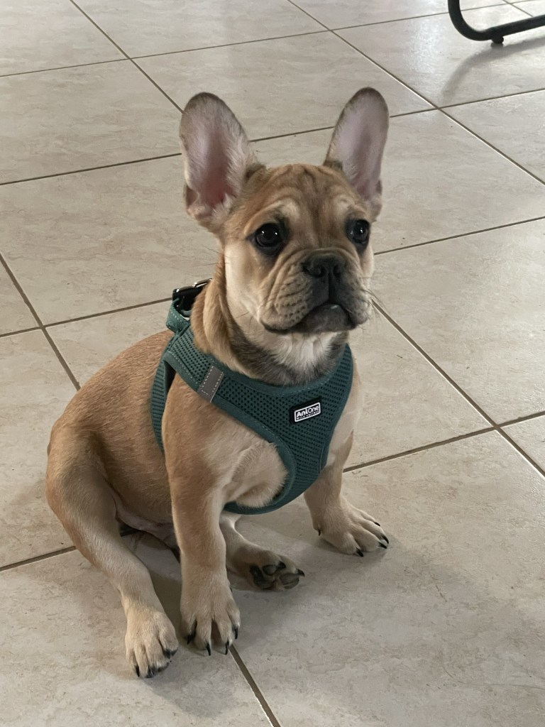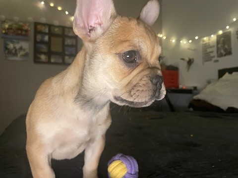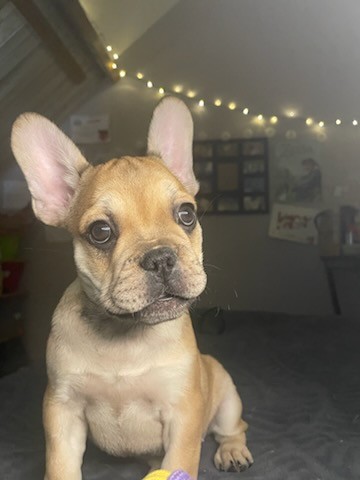 Aram finit sa douzième semaine, il pèse pas loin de 4 kg, et passe son temps, quand la jeune maîtresse et moi sommes dans la nursery, à réclamer des câlins, des bisous, monter sur les genoux, etc. Bref, un bouledogue français qui a besoin de plein de câlins ! Il est resté fauve clair, sans masque noir, et a un très joli nez un peu allongé, gage d’une bonne respiration. Il cherche toujours sa famille trois étoiles !