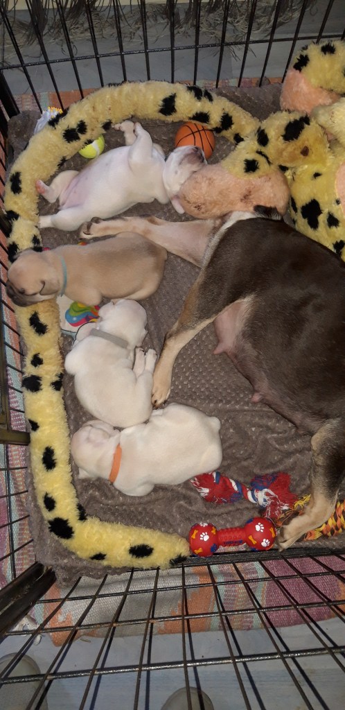 Je vous tiendrai au courant de son évolution, mais déjà elle couine pour ses besoins la nuit, et fait très volontiers dehors, si la porte est ouverte. Elle mange comme quatre, joue avec les autres chiens, et court partout.