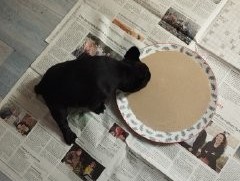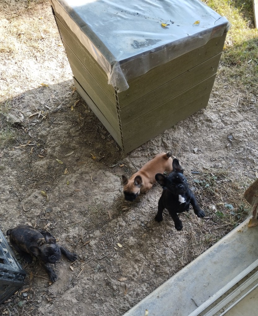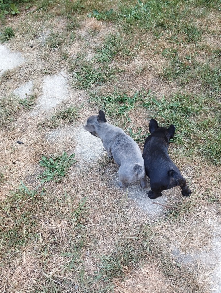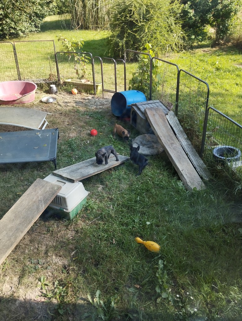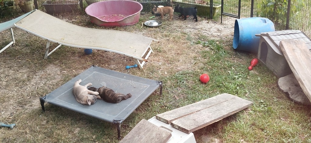 Il est en train de jouer à la bagarre avec sa grande copine Aïko, les autres sont peu intéressées. Aslan est le diablotin de service : je l’ai surpris à promener les gamelles d’eau, un coup je les retrouve sous le trampolin, un coup dans le bidon bleu… Il en faut toujours un comme ça dans une portée, eh bien cette fois c’est Aslan !