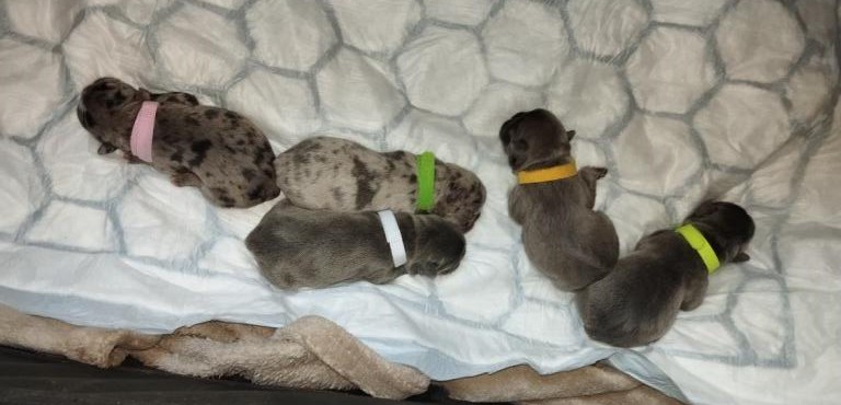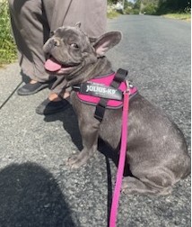 Avec sa couleur peu commune (bleu bringé) et son joli minois, gageons qu’il se fera admirer. Il a également appris à marcher en laisse pour pouvoir faire plein de promenades.